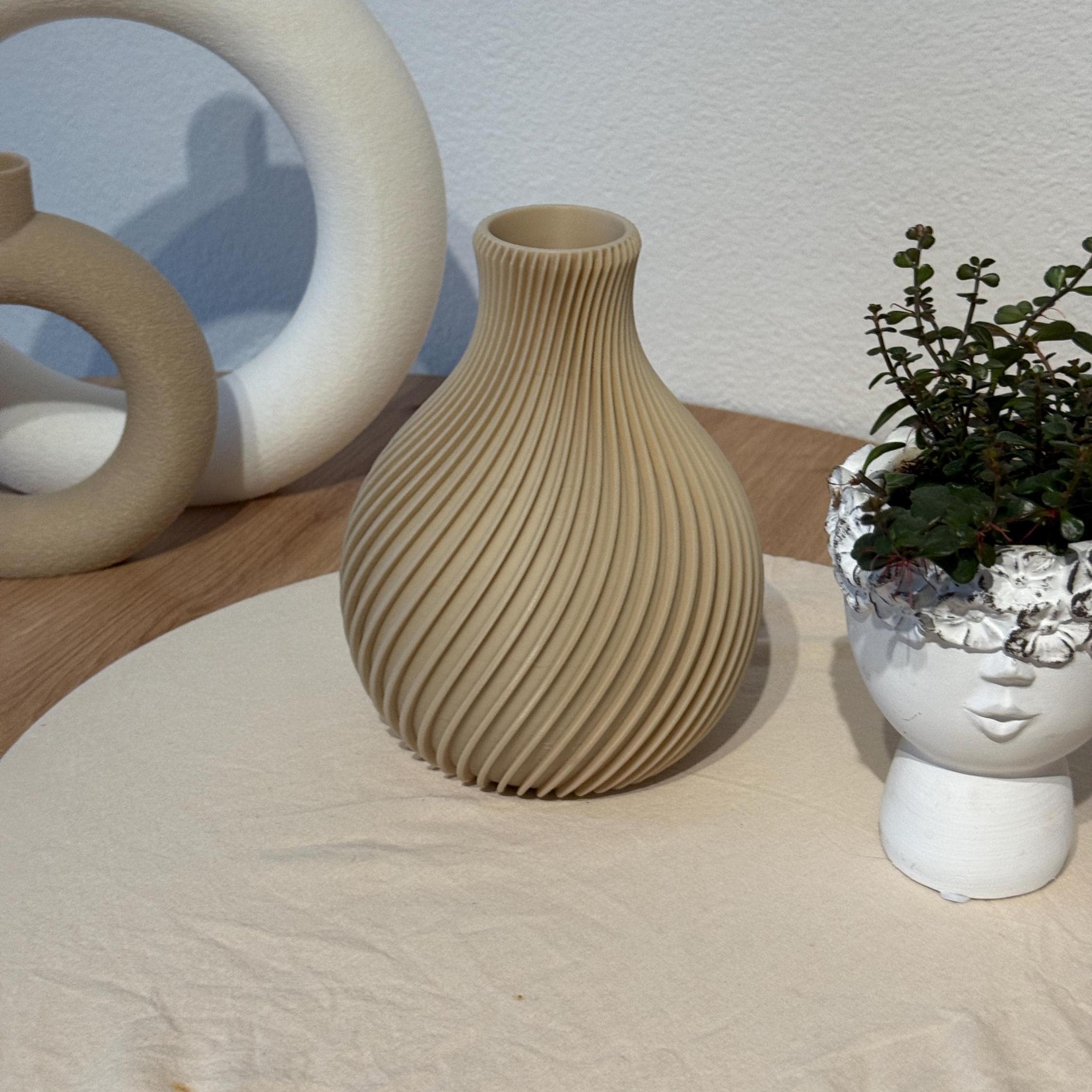 This stylish spiral vase offers natural tranquility and modern design. Its organic ribbed structure creates striking shadows in the light. Perfect as a decorative element, it makes a calm, minimalist statement. Crafted with a modern, organic design and a gentle ribbed texture, each piece is unique. Ideal for those who love modern interiors and handmade decor.
